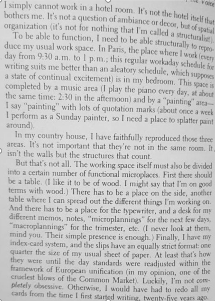 Which brings me around—eventually—to desks. The desk, which used to be the kitchen table—has become the centre of my house. It’s where I write, work, teach, zoom, and eat. Many writers have documented their desk topologies—from Georges Perec’s obsessive listing of the objects on his desk in Species of Spaces and Other Pieces to Roland Barthes rather decadent arrangement recalled in “An Almost Obsessive Relation To Writing Implements”– a 1973 interview for Le Monde, later published in his collected interviews, The Grain of the Voice, in 1985: